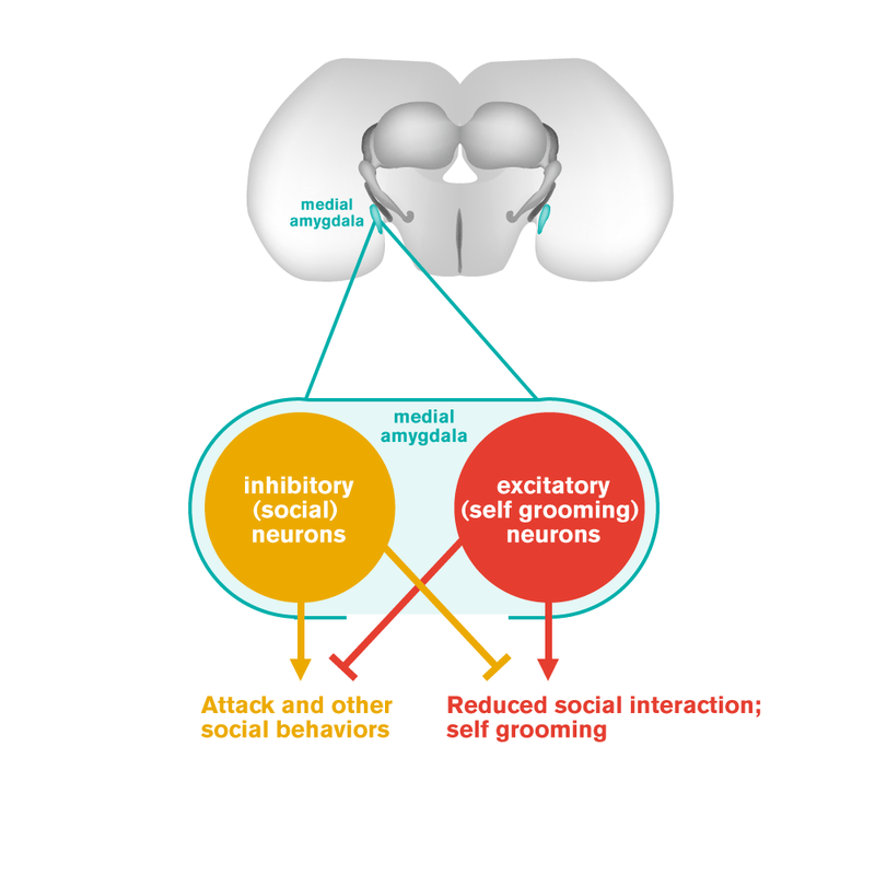 Humans with autism often show a reduced frequency of social interactions and an increased tendency to engage in repetitive solitary behaviors. Autism has also been linked to dysfunction of the amygdala, a brain structure involved in processing emotions. Now Caltech researchers have discovered antagonistic neuron populations in the mouse amygdala that control whether the animal engages in social behaviors or asocial repetitive self-grooming. This discovery may have implications for understanding neural circuit dysfunctions that underlie autism in humans.
