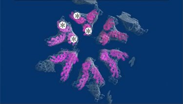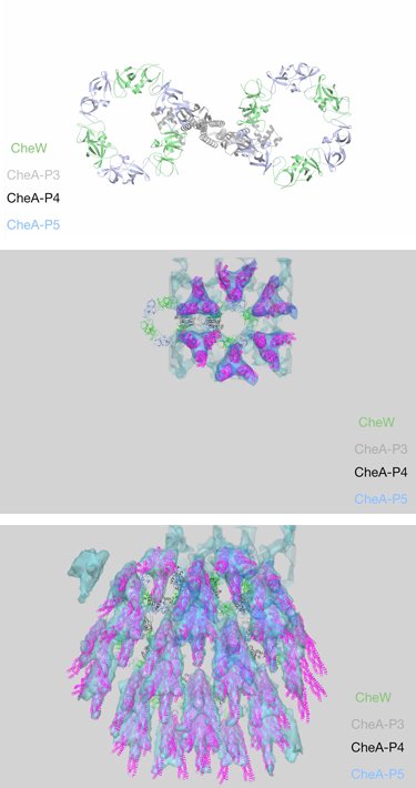 For help with the next piece, Caltech researchers teamed up with Brian Crane of Cornell University, who then solved a crystal structure featuring a double ring of chemoreceptor fragments and parts of CheA and CheW. While viewing a computer model of the structure, the researchers realized that splitting the double ring into two and then lining up the receptor fragments in each ring with the receptors in Briegel's ECT images produced a perfect match.