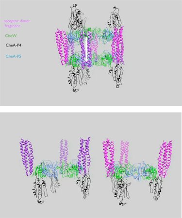 Biologists have long known that two additional proteins, called CheA and CheW, are also found within groups of chemoreceptors. These proteins were thought to hold the receptors together and to activate a protein that then binds to the flagellar motors and causes a change in its spinning direction. But no one knew exactly how CheA, CheW, and the receptors were linked.